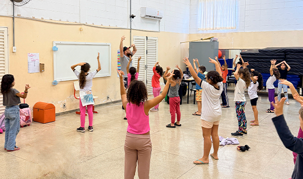 Os estudantes têm acesso a diferentes oficinas como: dança; música; teatro; artesanato; esportes; estudo e pesquisa; jogos e matemática; robótica; e brincadeiras.