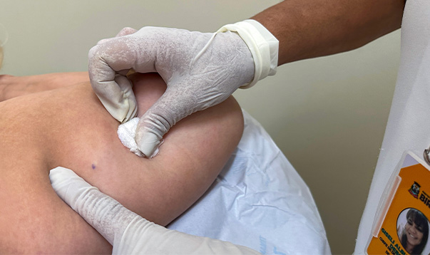 A enfermeira explica que o procedimento é simples e não oferece risco. O procedimento é realizado com anestesia local, sendo praticamente indolor.
